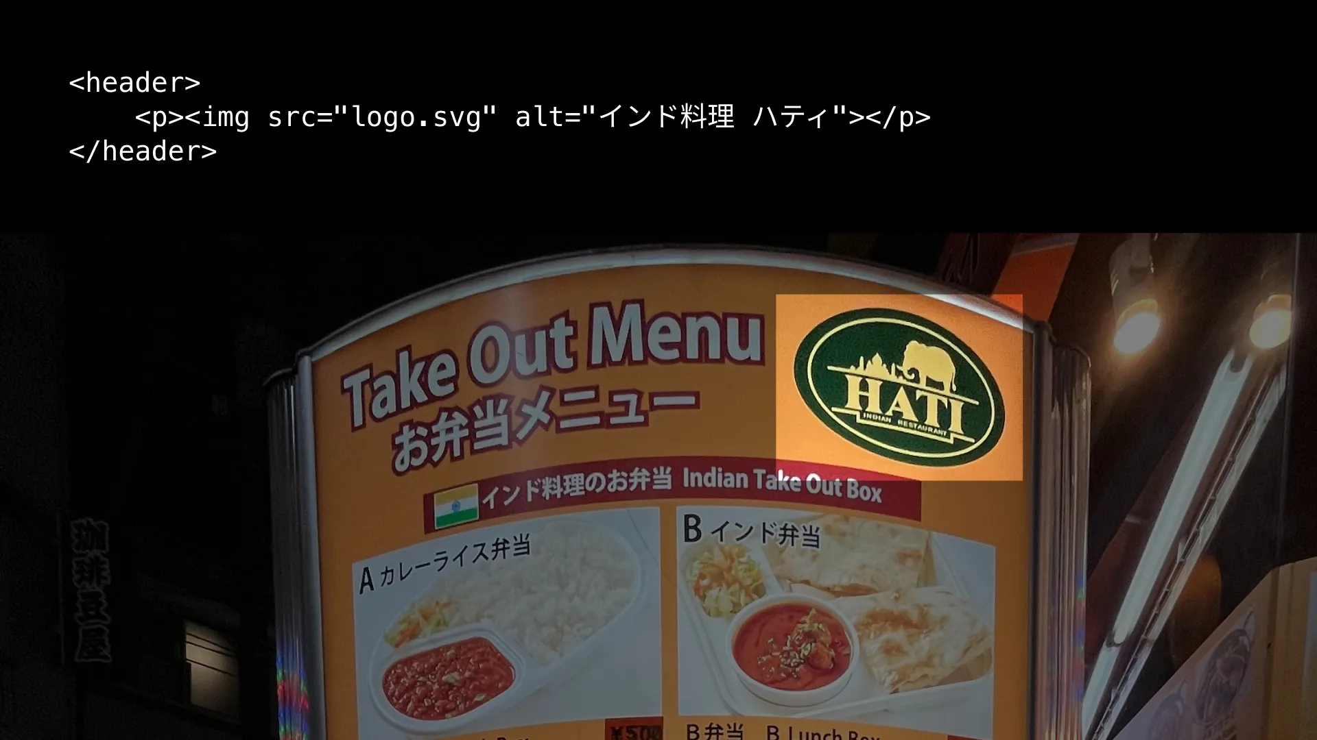 一つポイントになるのが、そのaltの値です。ロゴとしては「HATI INDIAN RESTAURANT」と表記されていますが、altは店名として正式な表記であろう「インド料理 ハティ」とします。altの書き方についてはいくつかの考え方がありますが、基本としては、その画像をそのままテキストに置き換えてもおかしくないようにしておくのがセオリーです。