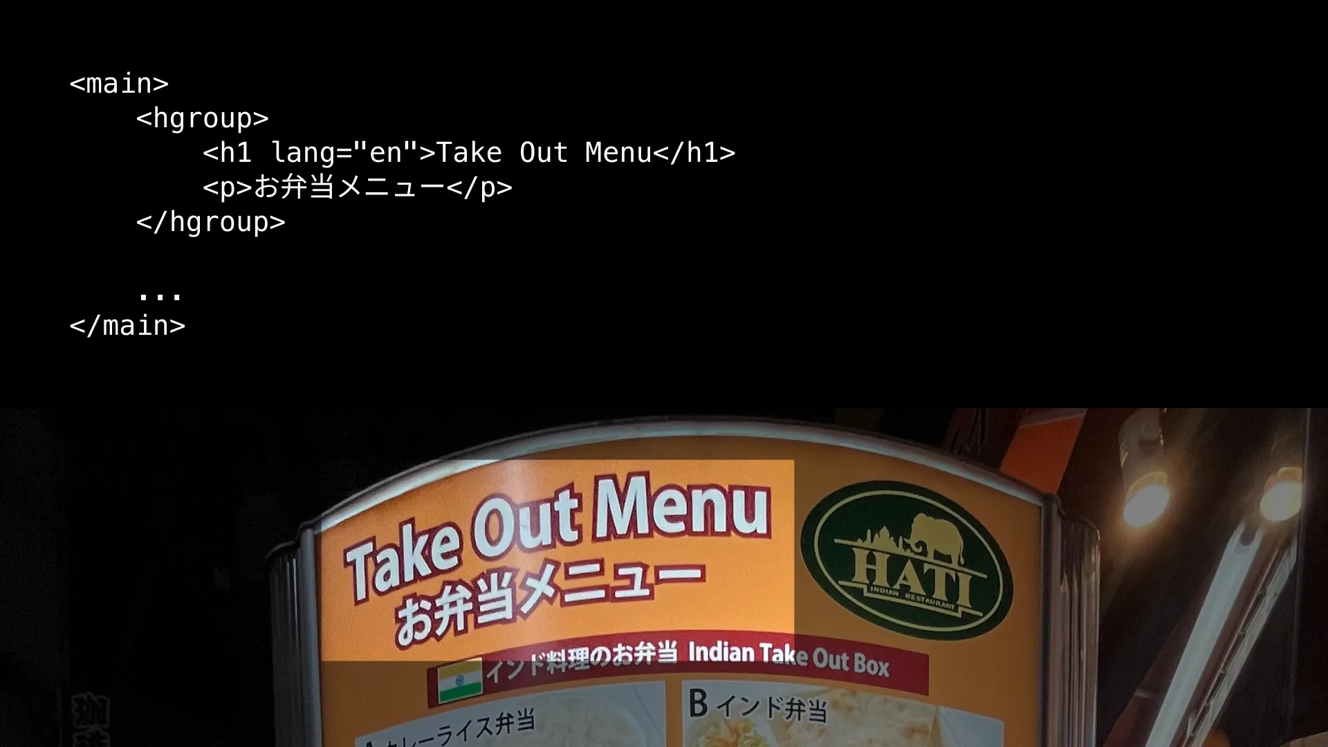 続いて看板の左上には、大きな文字で「Take Out Menu」「お弁当メニュー」とあります。ここからはページ固有の要素と言えるでしょう。外側はmainで囲いつつ、「Take Out Menu」はh1にします。