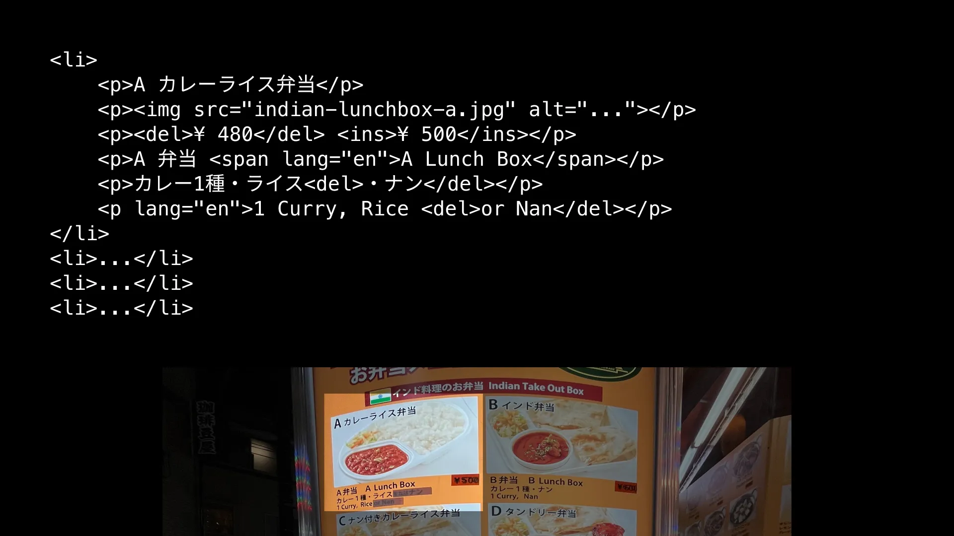 それらに続いて「インド料理のお弁当」という見出しがあり、お弁当の種類がカード状に並んでいます。カードが六つあるので、これらをulでまとめてしまうのがよさそうに見えます。