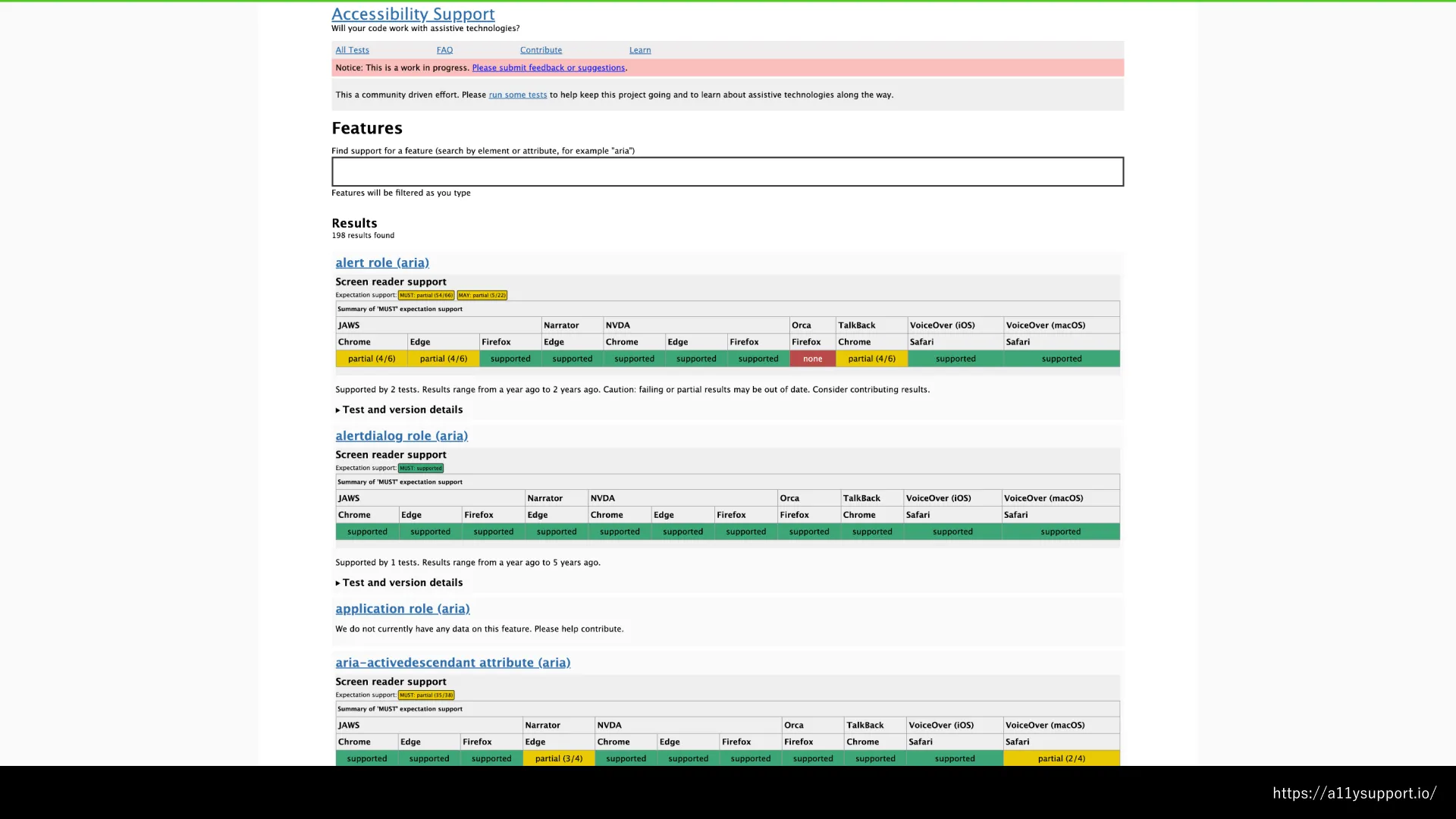 そして、ブラウザ・OS・スクリーンリーダーでのサポート状況、ユーザーにとっての使い勝手について。環境によって、HTMLの機能が実装されていたりされていなかったりすることがありますが、これはWAI-ARIAにおいても同じです。仕様としては存在していても、ブラウザに実装されていないから実質使えない、ということがあります。そういったことを調べられるツールとして、Can I use…のWAI-ARIA版のようなものがあります。