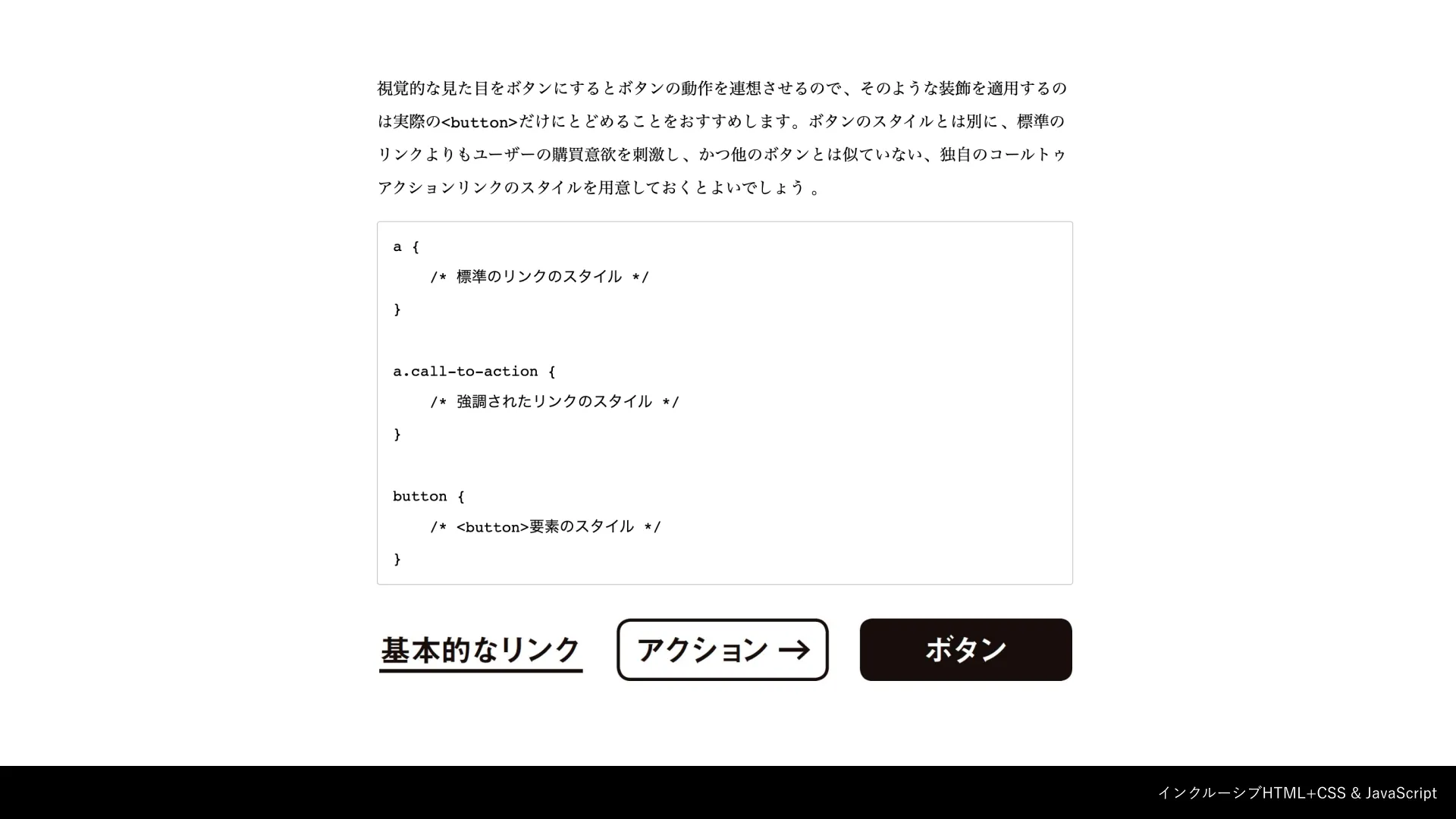 『インクルーシブHTML+CSS & JavaScript』では、いわゆるボタンリンクの実装方法について紹介されています。いわく、ボタンリンクと本当のbuttonは、同じ見た目にせずにそれぞれ別々にしてしまおう、という話です。