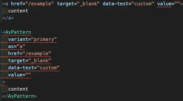 そして、as propを使うと、元のコンポーネントとasに当たるコンポーネントの双方に対するpropを同時に記述することになり、どのpropがどのコンポーネントのためのものかが理解しづらくなる。さらに、元のコンポーネントとasに当たるコンポーネントに同じ名前のpropがあるとコンフリクトしてしまう。